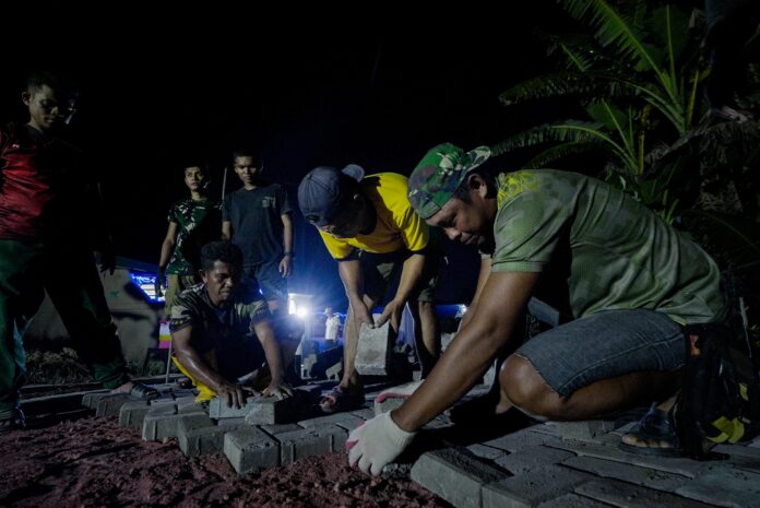 Di bawah temaram lampu dan selimut kegelapan malam, para prajurit bersama warga Kota Kendari bahu-membahu merajai jalanan dengan pemasangan paving blok pada Selasa (3/3).
