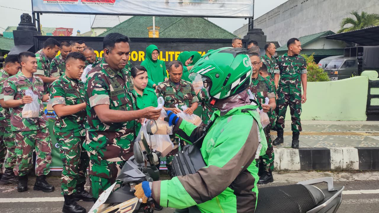 Wonogiri – Komandan Kodim 0728/Wonogiri Letkol Inf Rodricho Ivan Pattihahuan didampingi Ketua Persit KCK Cabang XLIX berbagi takjil menjelang berbuka puasa kepada masyarakat yang melintas di jln. Jenderal Sudirman, tepatnya di depan Markas Kodim.