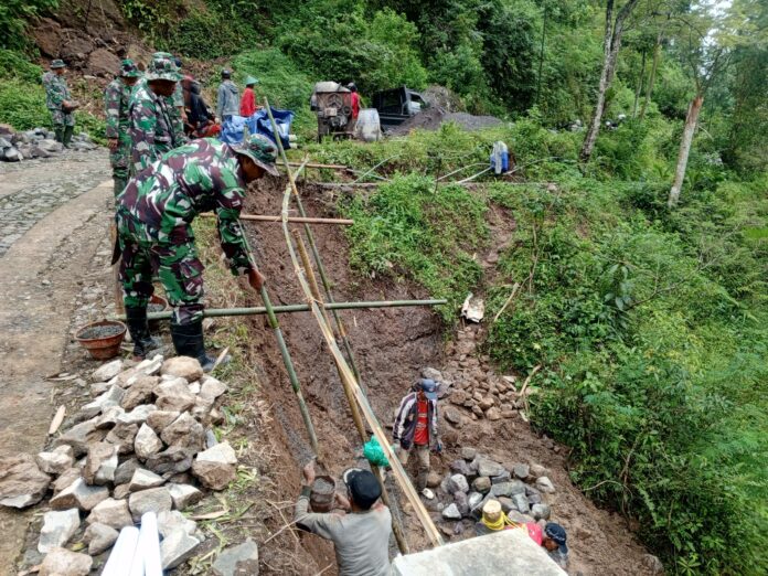 Wonogiri – Di tengah sunyi wilayah terpencil yang selama ini luput dari sorotan, derap langkah prajurit TNI berpadu dengan keringat warga memecah keheningan. Melalui program TMMD, pembangunan talud dikebut tanpa mengenal lelah. Batu demi batu disusun, tanah digali, dan semen diaduk, Anggota Satgas TMMD Reguler ke-127 menunjukkan semangat juang yang tinggi dalam melaksanakan pembangunan talud untuk penahan jalan. Di Desa Kembang Kec. Jatipurno Kab. Wonogiri, Kamis (12/2/2026).
