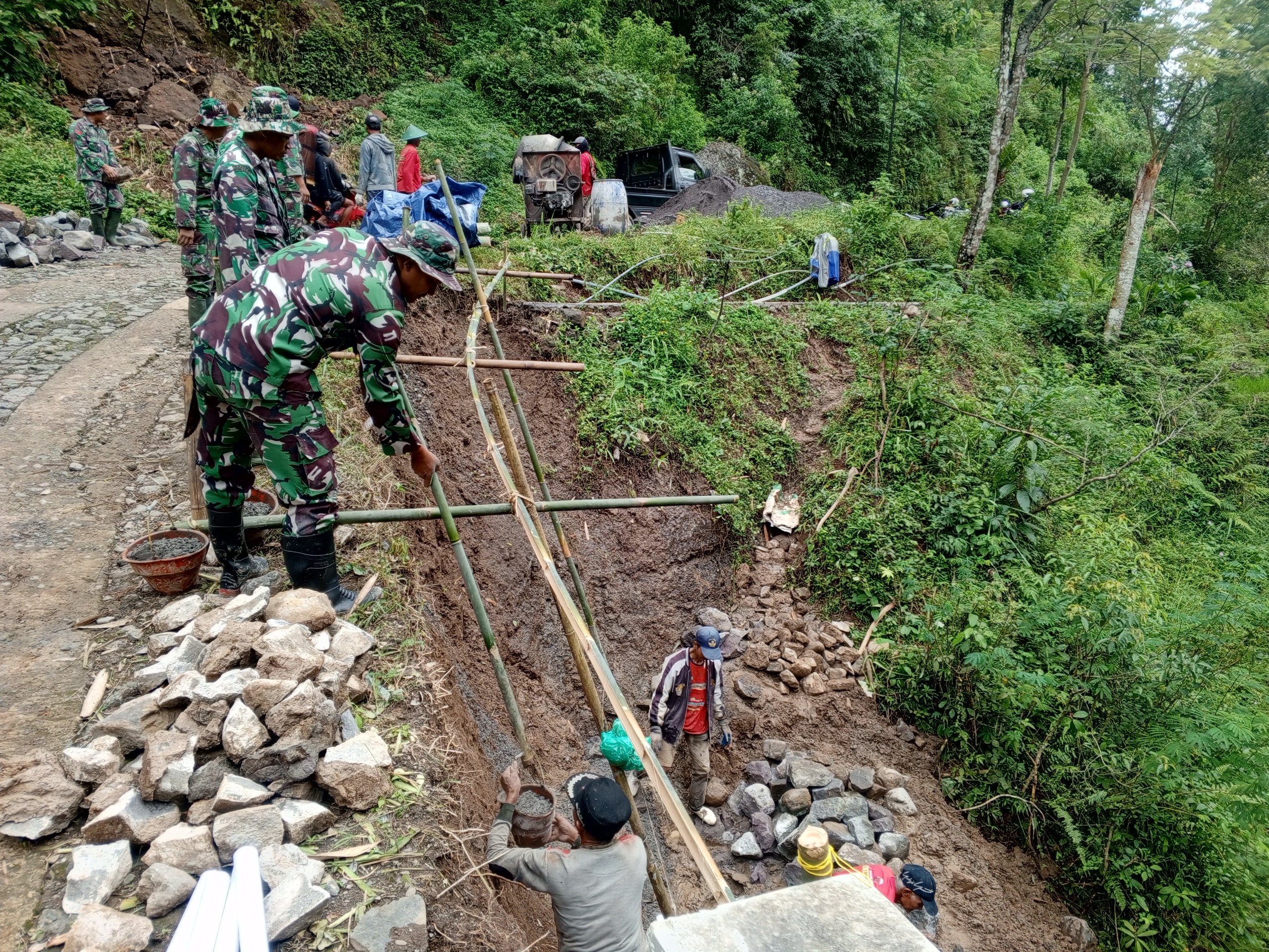 Meskipun berhadapan dengan cuaca yang tidak menentu. Satgas TMMD Reguler ke-127 Kodim 0728/Wonogiri tak mengurangi mental mereka untuk selalu bersemangat bersama warga membangun talud.