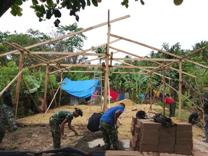 Semangat kemanunggalan TNI dan rakyat begitu terasa di lapangan, di mana personel Kodim 1417/Kendari bersama masyarakat bahu-membahu menaikkan material kayu dan baja ringan.