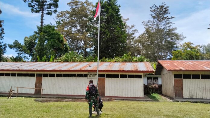 Wamena – Satgas TNI Manunggal Membangun Desa (TMMD) ke-126 Kodim 1702/Jayawijaya terus menunjukkan kepeduliannya terhadap fasilitas pendidikan di wilayah pedalaman. Kali ini, Satgas TMMD melaksanakan kegiatan penyiapan tiang bendera di depan SD Inpres Algonik, Distrik Pyramid, Kabupaten Jayawijaya, Minggu (12/10/2025).