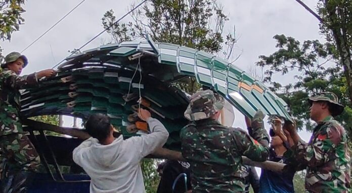 Proses pemasangan kubah dilakukan dengan penuh kehati-hatian dan gotong royong. Sejumlah prajurit TNI bekerja sama dengan warga menaikkan kubah menggunakan tangga. Sementara di bagian bawah, warga lain ikut membantu menyiapkan bagian yang lain serta memastikan setiap tahap berjalan aman dan lancar. Suasana kerja penuh semangat dan canda tawa membuat kegiatan tersebut terasa hangat di tengah teriknya sinar matahari.