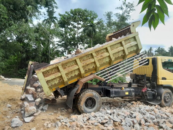 Truk pengangkut material bangunan terlihat hilir mudik tanpa henti, menyuplai kebutuhan batu, pasir, hingga semen menuju titik pengerjaan jalan dan fasilitas umum.