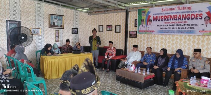 Muratara,BRS – Pemerintah Desa (Pemdes) Maur Baru, Kecamatan Rupit, Kabupaten Musi Rawas Utara (Muratara), menggelar Musyawarah Perencanaan Pembangunan Desa (Musrenbangdes) untuk Tahun Anggaran 2025, pada Jumat (17/10/2025). Musrenbang ini menjadi forum strategis dalam menyerap aspirasi masyarakat serta menyusun prioritas pembangunan yang tepat sasaran dan berkelanjutan.