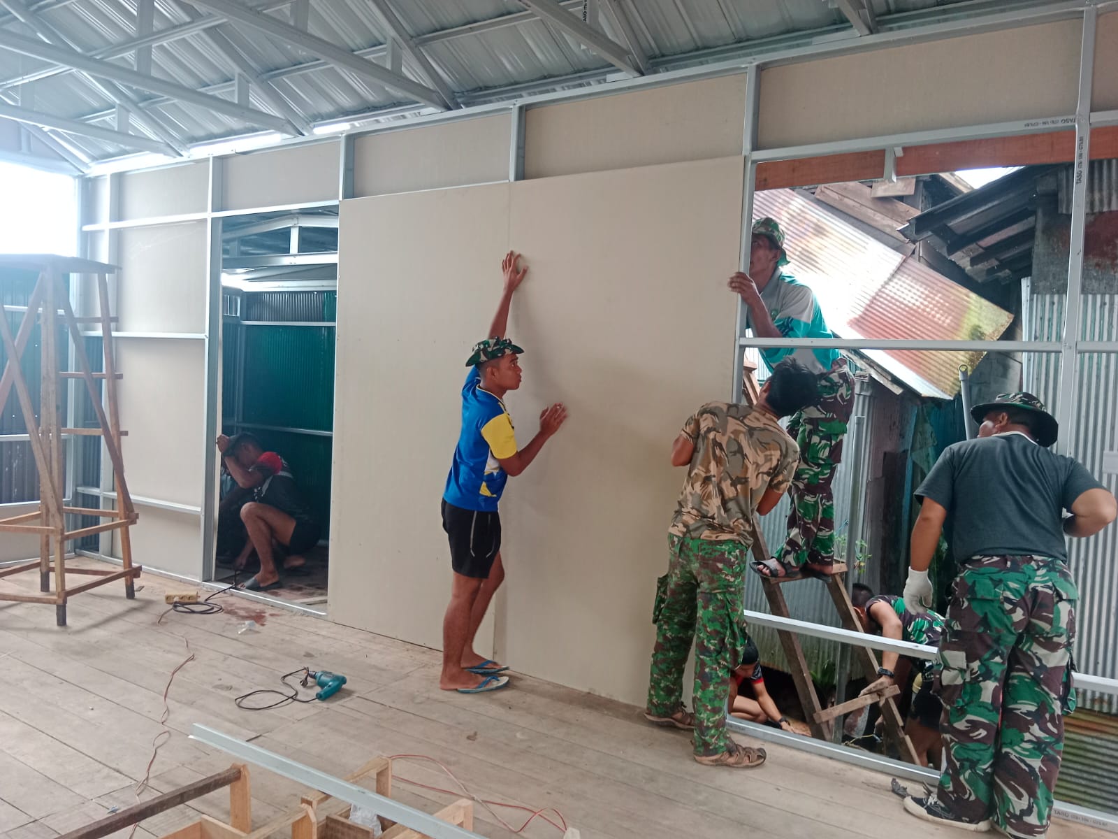 Sebelumnya, Satgas TMMD bersama warga setempat telah menyelesaikan pembongkaran bagian rumah yang rusak serta pemasangan rangka dan struktur dasar bangunan. Dengan pondasi dan rangka yang telah kokoh, pengerjaan dilanjutkan dengan pemasangan dinding secara bertahap dan teliti agar hasilnya kuat, rapi, dan tahan terhadap cuaca.