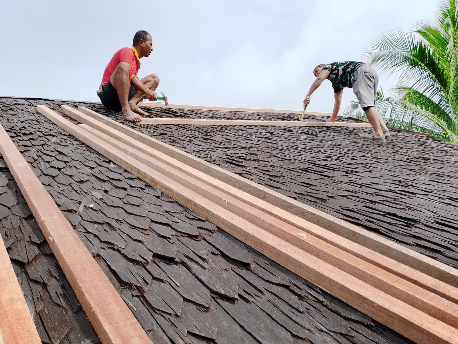 Amuntai – Proses rehabilitasi Tempat Pengajaran Al-Qur’an (TPA) Al Ikhlas di Desa Hambuku Hulu, Kecamatan Sungai Pandan, Kabupaten Hulu Sungai Utara, kini mencapai tahap perbaikan atap. Senin (23/02/2026).