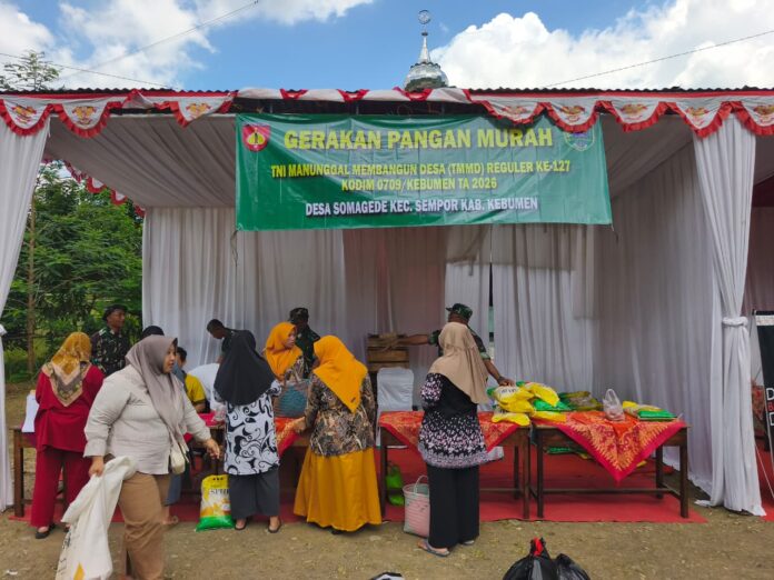 Kebumen – Gerakan Pangan Murah menjadi salah satu kegiatan yang mewarnai upacara penutupan TMMD Reguler ke-127 Kodim 0709/Kebumen di Desa Somagede, Kecamatan Sempor, Rabu (11/03/2026). Kegiatan ini digelar sebagai bentuk kepedulian terhadap kebutuhan masyarakat sekaligus membantu warga memperoleh bahan pokok dengan harga terjangkau.
