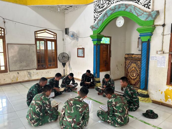 BANYAUASIN – Meskipun disibukkan dengan berbagai kegiatan sasaran fisik dalam program TNI Manunggal Membangun Desa (TMMD) ke-127, anggota Satuan Tugas (Satgas) Kodim 0430/Banyuasin (BA) tetap menyempatkan diri untuk melaksanakan tadarus Al-Qur’an di bulan suci Ramadan. Kegiatan tadarus ini dilaksanakan di Masjid Jami Darusalam, Desa Wonosari.