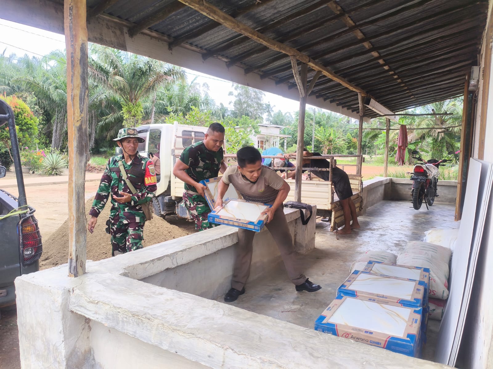 Kegiatan ini berlangsung dengan penuh semangat dan kekompakan, sebagai bagian dari upaya percepatan pembangunan rumah yang menjadi sasaran utama dalam program TMMD. Dengan menggunakan tenaga manual dan alat sederhana, warga dan prajurit TNI saling bahu-membahu mengangkat material keramik dari tempat penyimpanan menuju lokasi pembangunan.