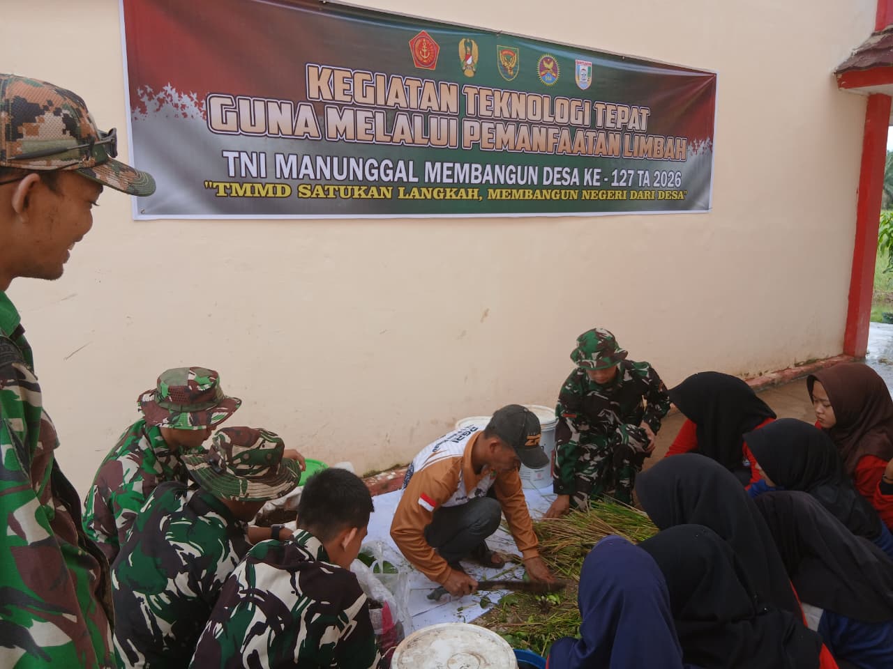Banyuasin – Dalam rangka mendukung pembangunan berkelanjutan dan meningkatkan kesejahteraan masyarakat desa, anggota Satgas TMMD ke-127 Kodim 0430/Banyuasin bekerja sama dengan warga Desa Wonosari serta siswa SMPN 3 Pulau Rimau melaksanakan kegiatan teknologi tepat guna berupa pemanfaatan limbah jerami padi, enceng gondok, dan gula merah menjadi pupuk cair dan pupuk padat. Kegiatan ini berlangsung di lokasi desa Wonosari, Kecamatan Pulau Rimau, Kabupaten Banyuasin.