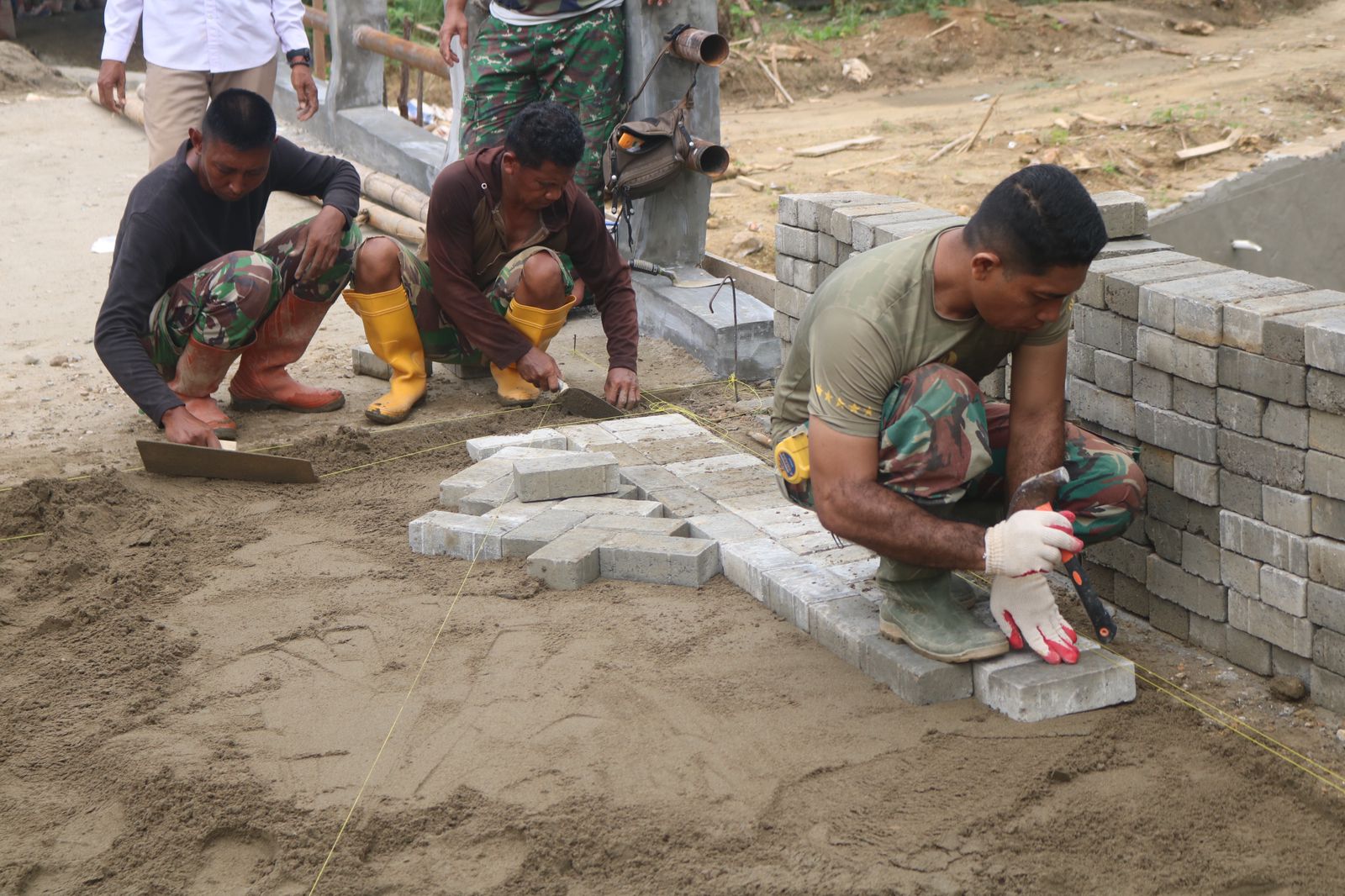 Dengan semangat gotong royong, pengerjaan dilakukan dengan teliti mulai dari perataan tanah hingga penyusunan material secara presisi.