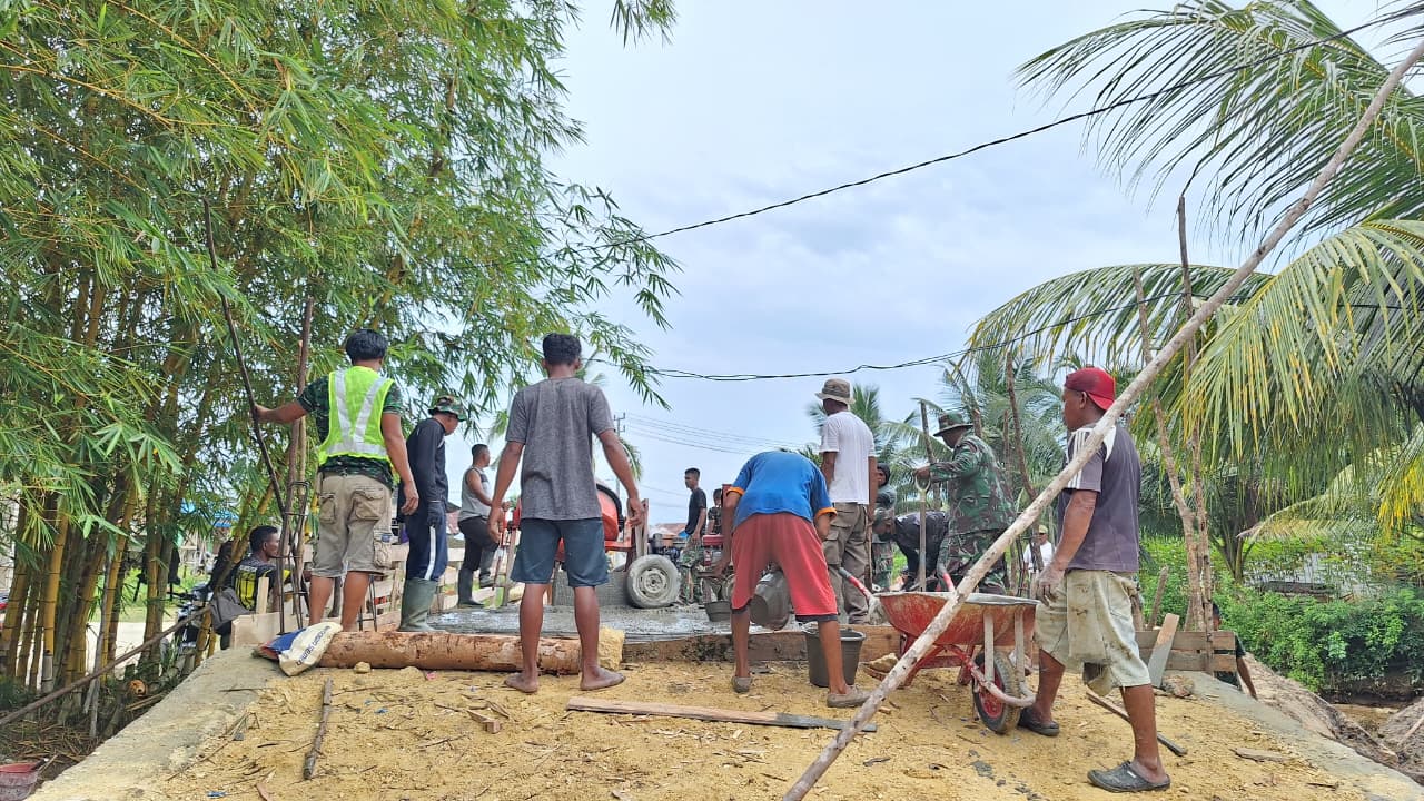 Sinergi antara TNI dan masyarakat terlihat jelas dalam pembagian tugas, mulai dari penyiapan material pasir dan semen hingga perataan permukaan beton di atas jembatan.