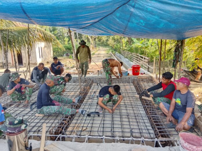 Di bawah naungan tenda darurat, sejumlah prajurit bersama warga setempat bahu-membahu mengikat dan menyusun rangkaian besi guna memastikan pondasi jembatan memiliki kekuatan maksimal sesuai dengan standar konstruksi yang direncanakan.