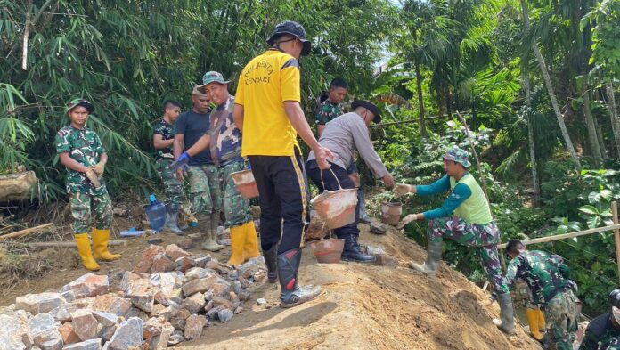 Dalam kegiatan tersebut, personel TNI dibantu oleh aparat Kepolisian setempat bekerja ekstra keras memindahkan material bangunan di medan yang cukup menantang.