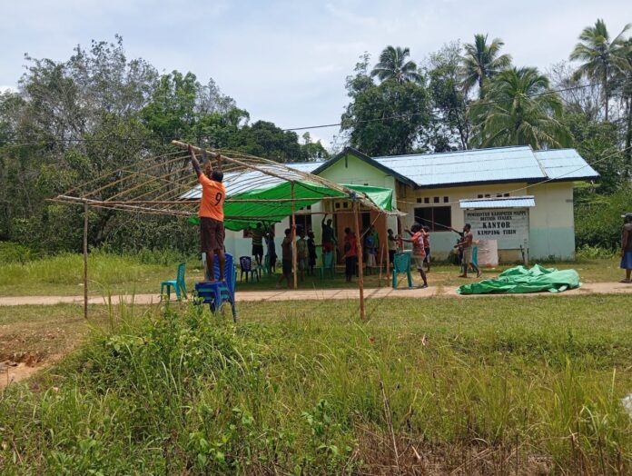 KAMPUNG YIBIN, DISTRIK VENAHA, KABUPATEN MAPPI – Seiring dengan pelaksanaan hari ke-21 TMMD (TNI Manunggal Membangun Desa) Kodim 1704/Mappi Ke-127 Tahun 2026 pada Senin (02/03/2026), masyarakat Kampung Yibin menunjukkan semangat gotong royong yang tinggi dengan bekerja sama mendirikan tenda tepat di depan Kantor Kampung. Tenda tersebut akan digunakan sebagai tempat untuk berbagai kegiatan sosialisasi, penyuluhan kesehatan, dan pemeriksaan kesehatan bagi seluruh warga masyarakat setempat.