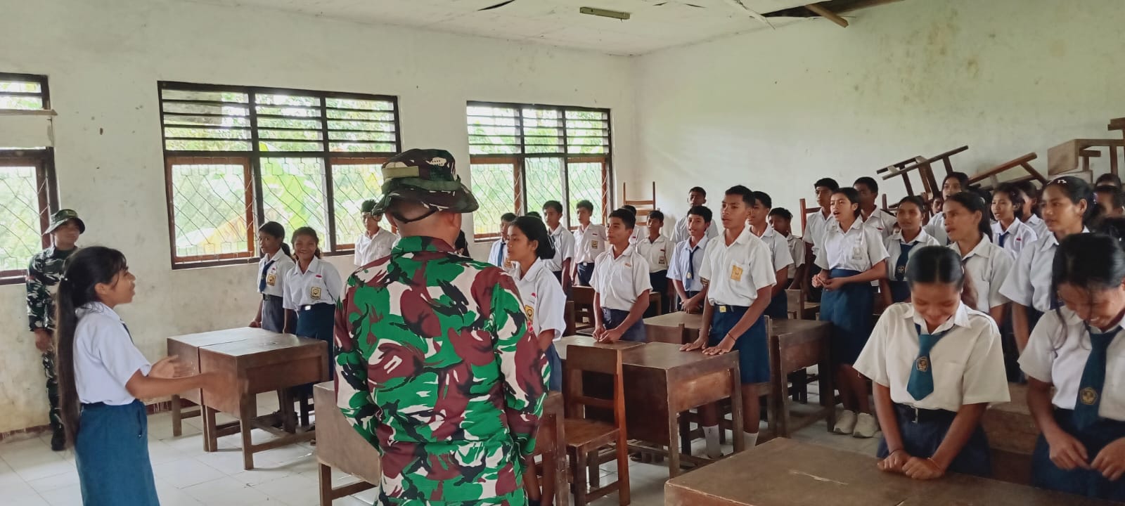 Para siswa tampak antusias mengikuti kegiatan tersebut. Mereka aktif berinteraksi dan menjawab pertanyaan yang diberikan anggota Satgas TMMD selama materi berlangsung. Suasana penuh keakraban terlihat antara personel TNI dan para pelajar.