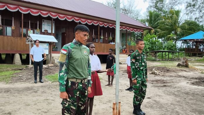 MIMIKA – Personel Satgas TMMD ke-128 Kodim 1710/Mimika terus menunjukkan kepedulian terhadap pembinaan generasi muda melalui kegiatan pelatihan Peraturan Baris Berbaris (PBB) dan tata cara pengibaran bendera kepada siswa-siswi SD Negeri Naena Keakwa, Kampung Keakwa, Rabu, (29/4/2026). Kegiatan tersebut dilaksanakan sebagai bagian dari persiapan upacara Hari Pendidikan Nasional (Hardiknas).