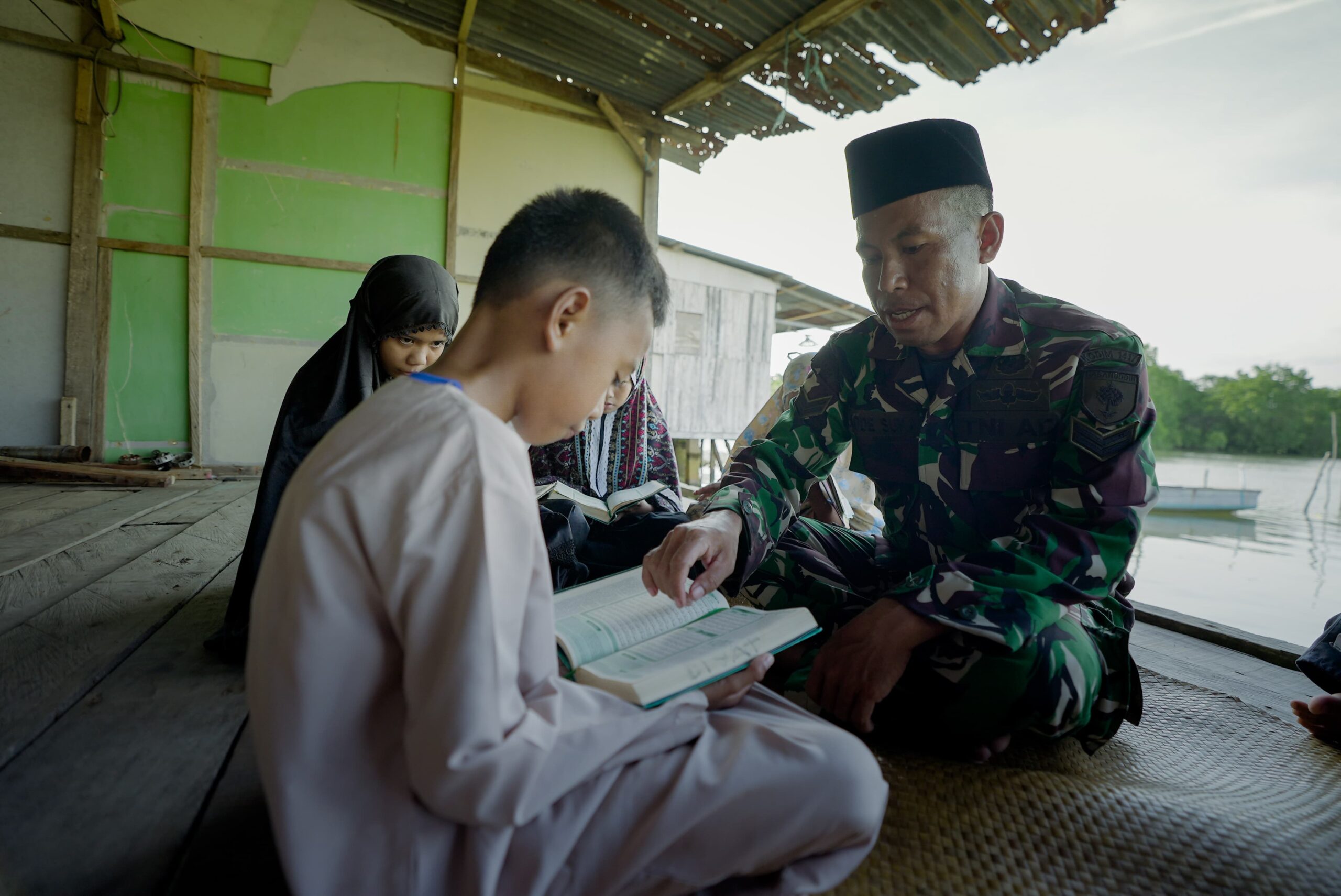 Mengambil tempat di sebuah rumah panggung sederhana di tepian air, para prajurit dengan sabar membimbing anak-anak setempat dalam melafalkan ayat-ayat suci Al-Qur’an.