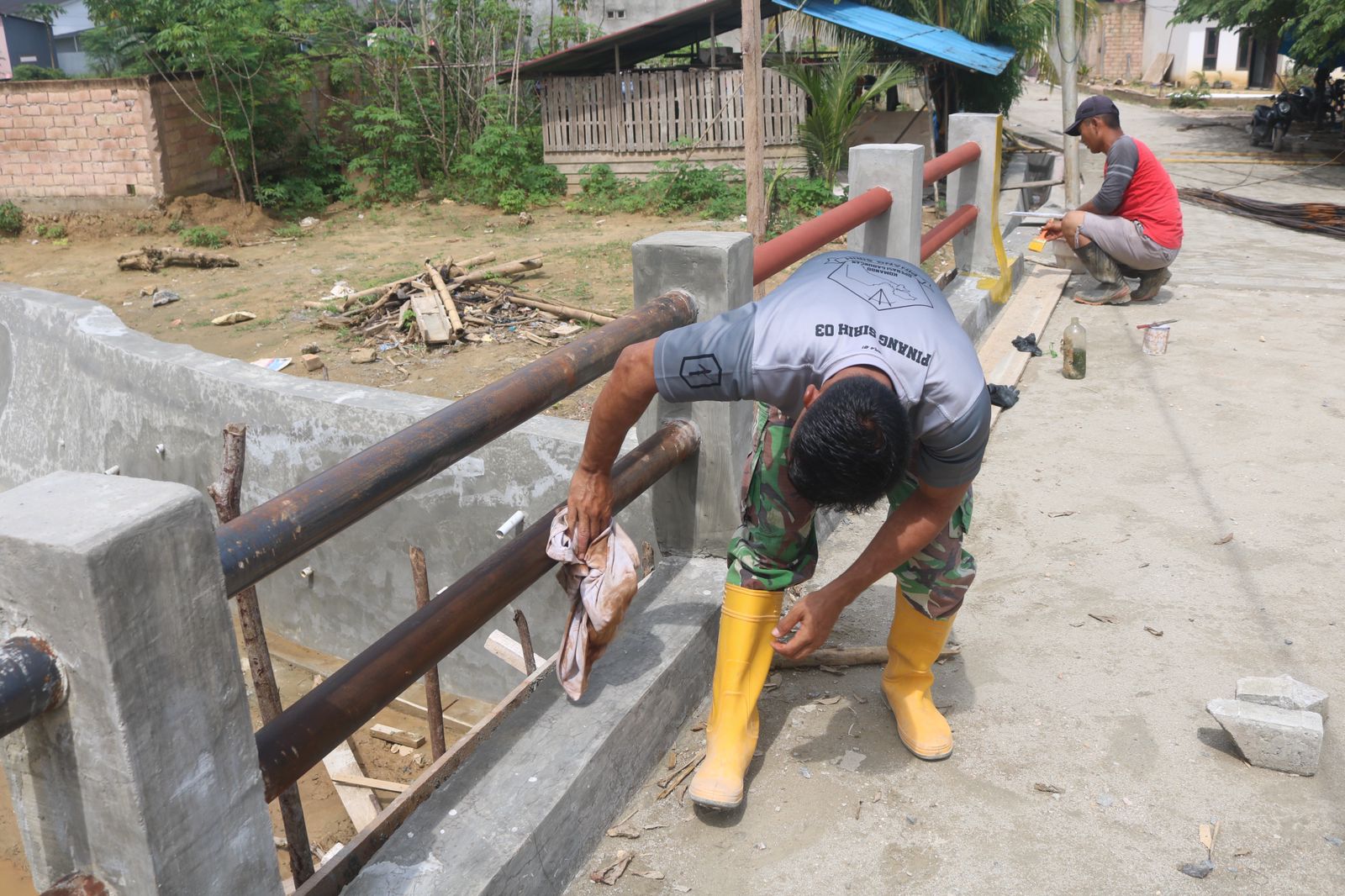 Dengan penuh ketelitian, para prajurit TNI bersama warga setempat bahu-membahu memoles pagar pembatas jembatan menggunakan kombinasi warna kuning dan merah yang mencolok.