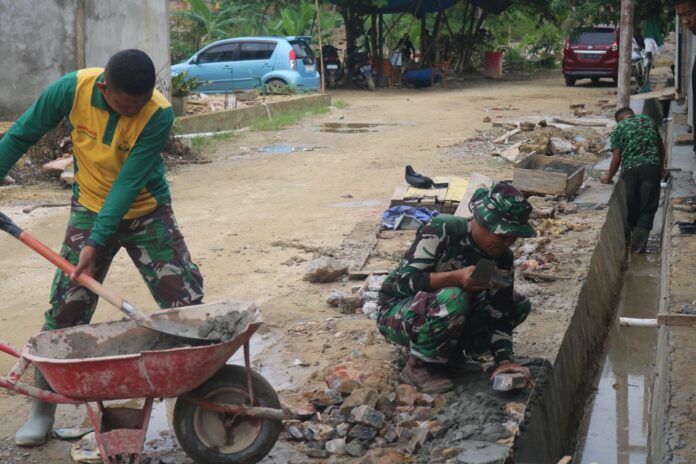Dengan balutan seragam loreng yang penuh noda semen, para prajurit bekerja bahu-membahu memastikan setiap jengkal saluran air terbangun dengan kuat guna mengantisipasi banjir di musim penghujan.