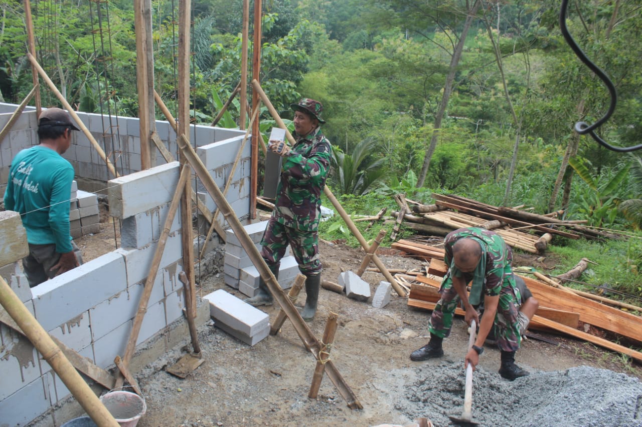 Kebumen – Kamis (05/03/2026), anggota Satgas TMMD Reguler ke-127 Kodim 0709/Kebumen, Serda Heri, membantu pemasangan hebel pada rumah tidak layak huni (RTLH) milik Bapak Sadikin di Desa Somagede. Kegiatan ini merupakan bagian dari sasaran fisik program TMMD untuk meningkatkan kualitas hunian warga.