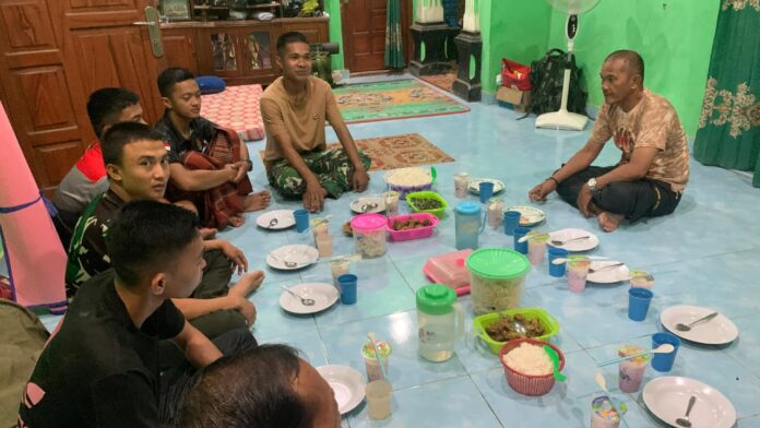BANYUASIN – Setelah seharian penuh melaksanakan berbagai sasaran fisik dalam program TNI Manunggal Membangun Desa (TMMD) ke-127, anggota Satuan Tugas (Satgas) Kodim 0430/Banyuasin (BA) menjalin kedekatan emosional dan keakraban dengan keluarga asuh, salah satunya keluarga Bapak Sikun, melalui kegiatan buka bersama. Senin (2/3).