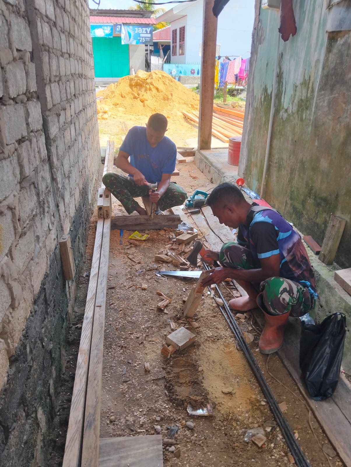 Kendari – Meski tengah hari, kerja sama antara anggota Satgas TMMD ke-127 Kodim 1417/Kendari bersama warga Kelurahan Nambo, Kota Kendari, terlihat begitu kompak saat mengerjakan sasaran fisik Rumah Tidak Layak Huni (RTLH), Minggu (8/3).