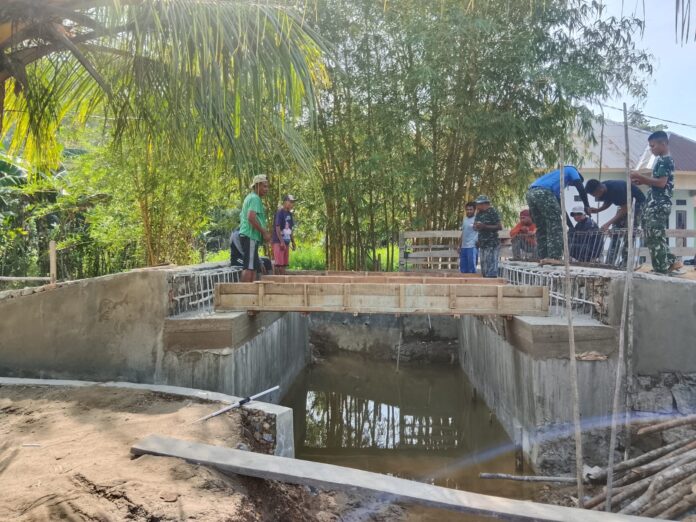 Kendari – Anggota Satgas TNI Manunggal Membangun Desa (TMMD) ke-127 Kodim 1417/Kendari bersama masyarakat Kelurahan Sambuli bahu-membahu melaksanakan pemasangan mal besi yang dilanjutkan dengan proses pengecoran jembatan pada Senin (23/2).
