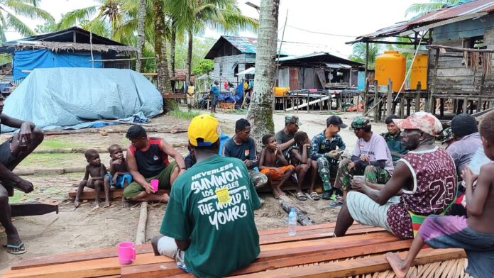 MIMIKA – Usai melaksanakan pekerjaan pembangunan sasaran fisik TMMD seharian di Kampung Keakwa, personel Satgas TMMD ke-128 Kodim 1710/Mimika memanfaatkan waktu istirahat dengan ngopi bareng bersama warga, Rabu (29/4/2026). Momen sederhana ini menjadi sarana mempererat kebersamaan sekaligus menjalin komunikasi yang akrab antara TNI dan masyarakat.