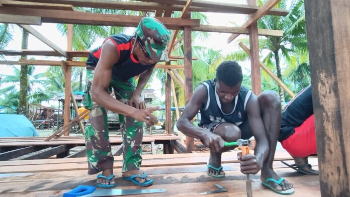 MIMIKA – Pembangunan 5 unit rumah tipe 36 yang menjadi sasaran fisik program TMMD ke-128 Kodim 1710/Mimika di Kampung Keakwa, Distrik Mimika Tengah, terus menunjukkan progres yang positif. Hingga Rabu (29/4/2026), seluruh unit rumah telah memasuki tahap pemasangan lantai sebagai bagian dari percepatan penyelesaian pembangunan.