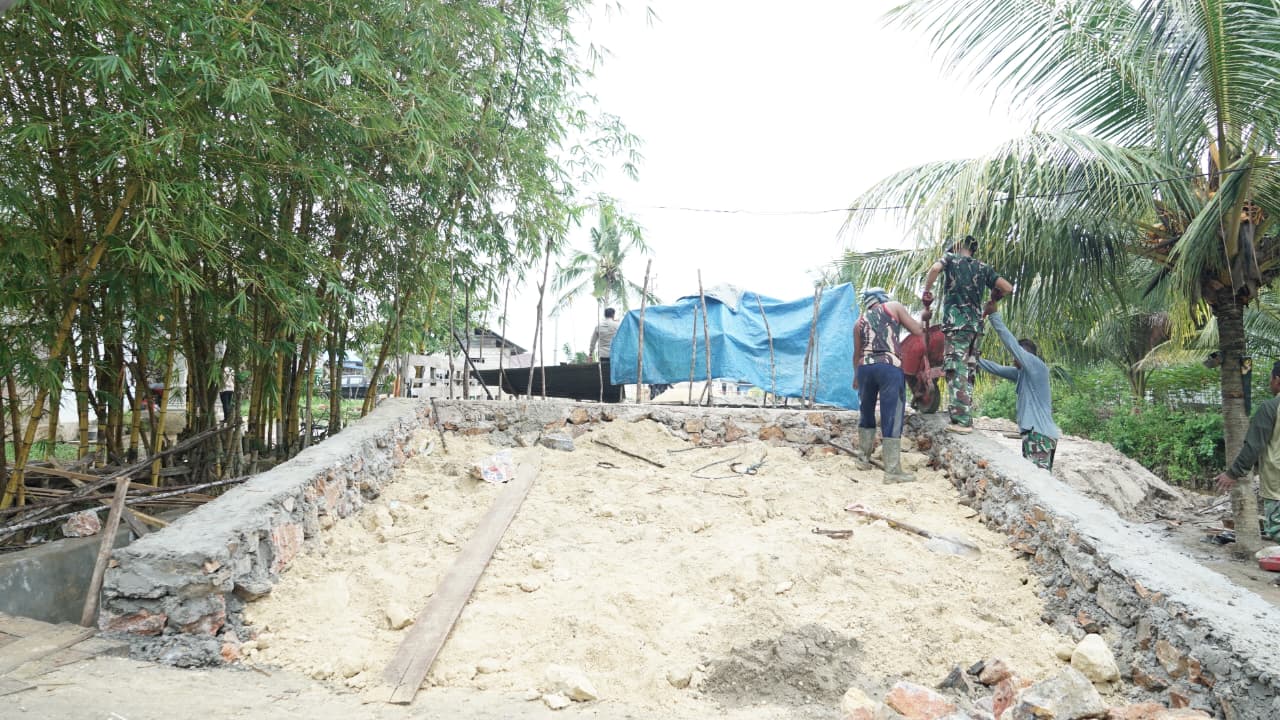 Kendari _ Kondisi lapangan yang licin dan berlumpur tidak menyurutkan semangat personel Satgas TMMD ke-127 Kodim 1417/Kendari di Kelurahan Sambuli. Minggu (22/2).