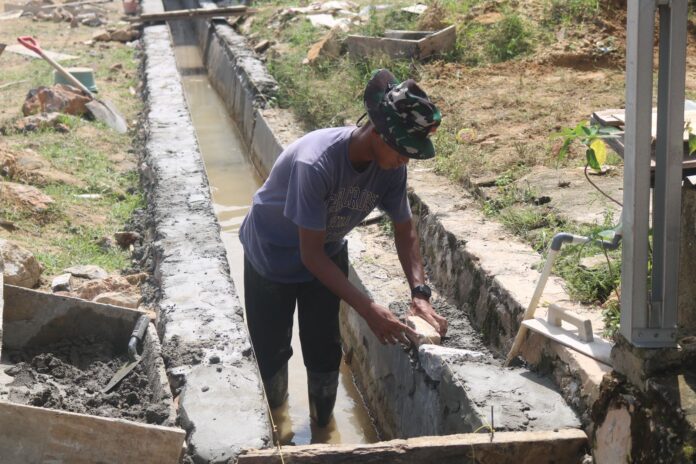 Dalam pantauan di lapangan, sejumlah prajurit TNI bersama masyarakat setempat terlihat bahu-membahu melakukan pemelesteran dinding penahan tanah (talud) dan pembangunan saluran drainase guna mencegah erosi serta mengoptimalkan aliran air.