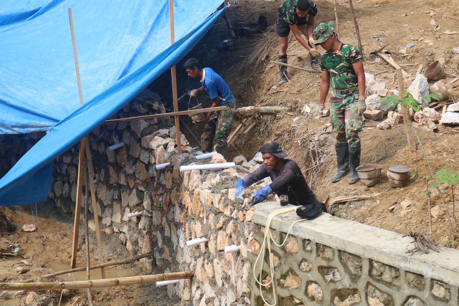 Para personel TNI bersama warga setempat tampak bahu-membahu menyusun material batu dan semen guna memastikan struktur bangunan kokoh untuk mengantisipasi terjadinya abrasi dan tanah longsor di area tersebut.