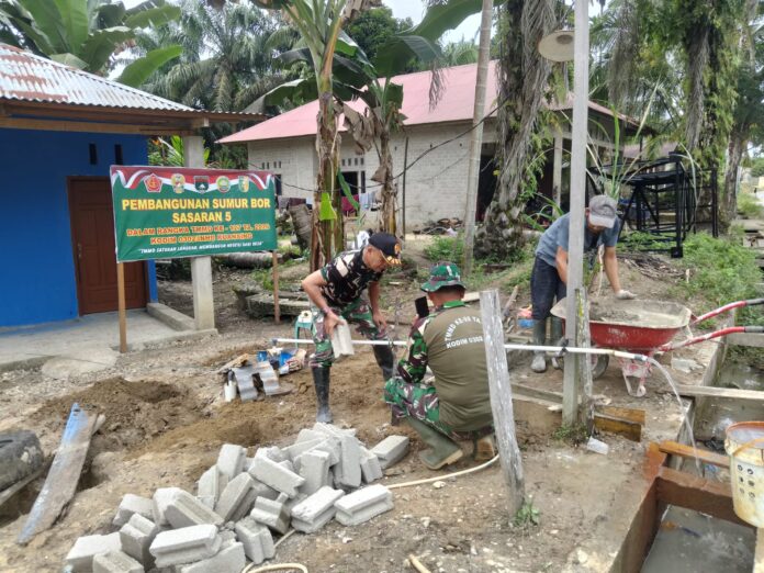 Kuantan Singingi – Program TNI Manunggal Membangun Desa (TMMD) ke-127 Kodim 0302/Inhu terus berupaya meningkatkan akses air bersih bagi masyarakat. Pada hari Minggu, 22 Februari 2026, kegiatan TMMD difokuskan pada pemasangan batako untuk tempat kran air sebagai bagian dari pembangunan sumur bor di Mushala Nurul Alif, yang berlokasi di Dusun 3 Desa Perhentian Luas, Kecamatan Logas Tanah Darat, Kabupaten Kuantan Singingi.