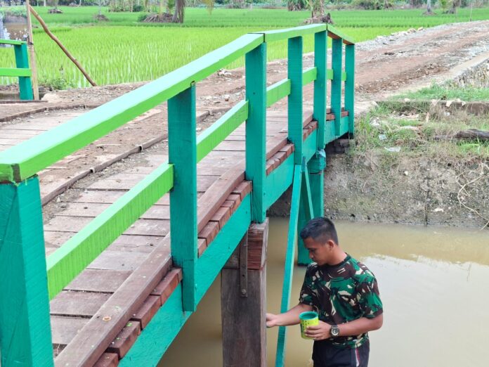 Amuntai – Program TNI Manunggal Membangun Desa (TMMD) ke-127 Tahun Anggaran 2026 yang dilaksanakan Kodim 1001/Hulu Sungai Utara–Balangan terus menunjukkan progres positif. Hingga Selasa (24/02/2026), pembangunan jembatan penghubung jalan usaha tani di Desa Hambuku Hulu, Kecamatan Sei Pandan, Kabupaten Hulu Sungai Utara, kini telah memasuki tahap finishing pengecetan.