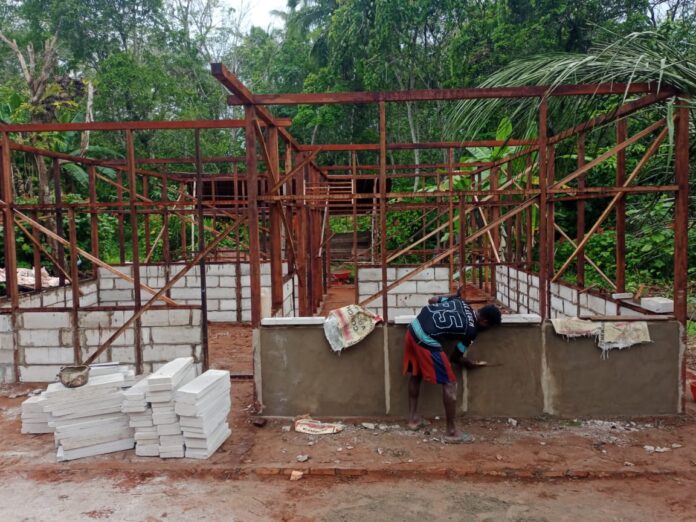 TMMD ke-127 Kodim 1704/Mappi Pembangunan RTLH Bapak Nikolaus Abohoy di Yibin Semakin Nyata, Penyetelan Rangka dan Pemasangan Batu Bata Terus Dikebut