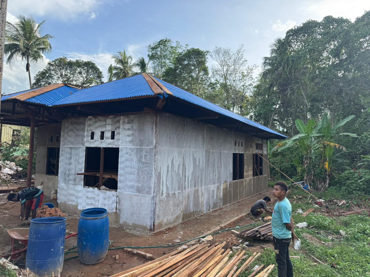Pemasangan seng dilakukan dengan teliti, memastikan atap rumah kuat dan tahan lama. Sementara itu, pemasangan batu dan plester dinding terus dikerjakan untuk memberikan struktur yang kokoh dan tampilan yang menawan.