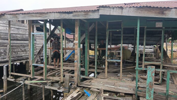 Personel Satgas bersama warga bahu-membahu membongkar dan membangun kembali struktur bangunan yang sebelumnya memprihatinkan.