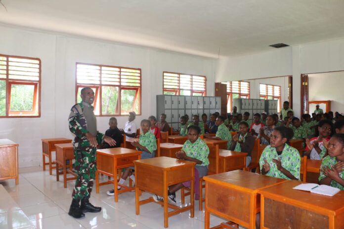 Wamena – dengan semangat membangun generasi muda yang cinta tanah air, Satuan Tugas TNI Manunggal Membangun Desa (TMMD) ke-126 Kodim 1702/Jayawijaya melaksanakan kegiatan penyuluhan Wawasan Kebangsaan kepada para siswa-siswi di wilayah Papua Pegunungan, Rabu (15/10/2025).