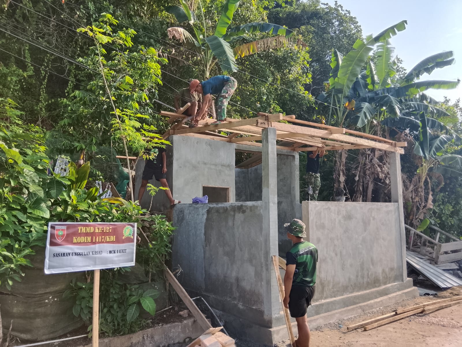 Kendari – Semangat gotong royong menyelimuti Kelurahan Sambuli, Kota Kendari, saat personel Satgas TMMD ke-127 Kodim 1417/Kendari bersama warga setempat bahu-membahu merampungkan pemasangan atap fasilitas Mandi, Cuci, Kakus (MCK), Minggu (8/3).